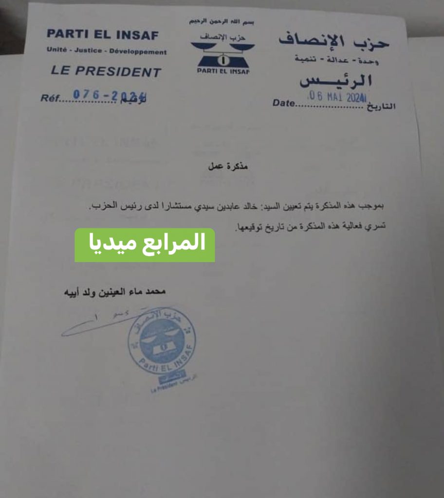 تم بموجب مذكرة صادرة عن رئيس حزب الإنصاف السيد ماء العينين ولد أييه تعيين الشاب المهندس خالد قيس عابدين سيدي مستشارا لدي رئيس الحزب .