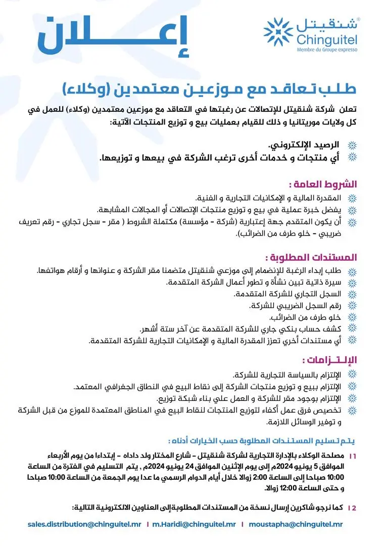 أعلنت شركة شنقيتل للاتصالات في موريتانيا رغبتها في التعاقد مع موزعين معتمدين في كل ولايات البلاد، من أجل بيع وتوزيع المنتجات التالية.