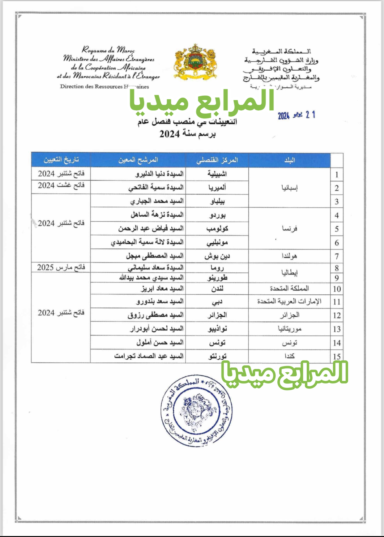 أصدرت وزارة الخارجية في المملكة المغربية الشريفة لائحة تعيينات جديدة لقناصلة المملكة في عدد من المدن العربية والعالمية برسم العام 2024.