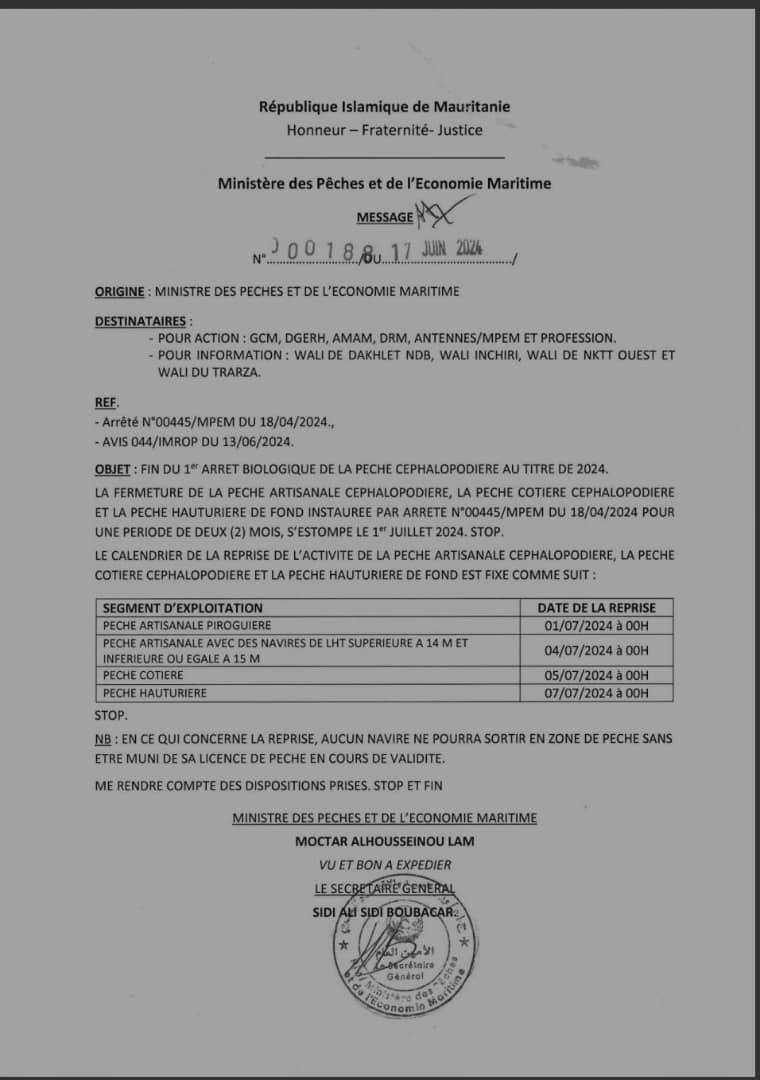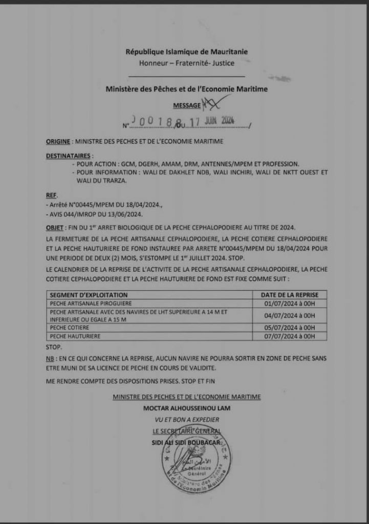 وبحسب وثيقة وقعها وزير الصيد والاقتصاد البحري مختار حسينو لام يتاريخ 17 يونيو 2024 فقد تقرر أن تكون تواريخ استئناف أنشطة الصيد على النحو التالي: