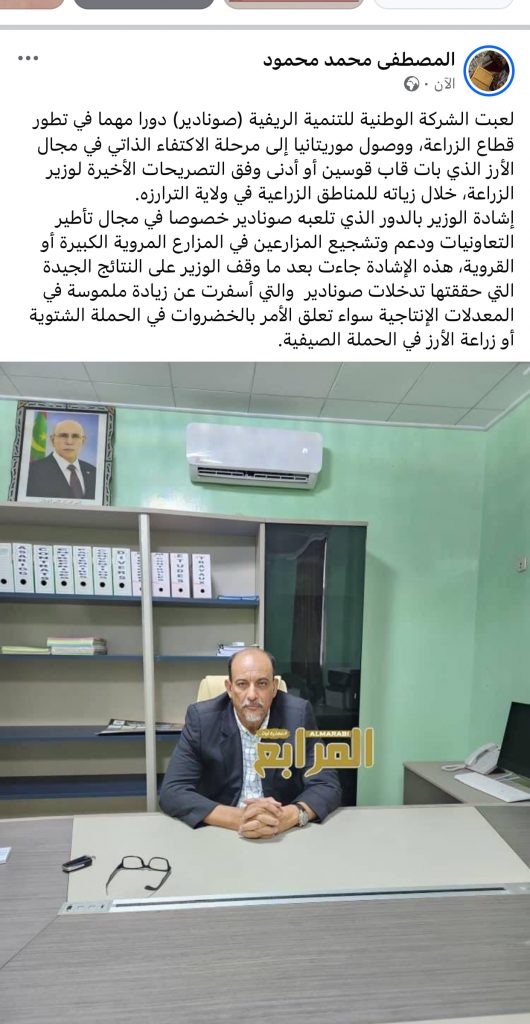 وفي إطار الحديث عن مساهمة “صونادير” في النهضة الزراعية الوطنية تحدث المدير العام لصونادير خلال مقابلة مع الإذاعة الوطنية عن الجهود الكبيرة التي بذلتها الدولة في المجال الزراعي من خلال تكلفيها لصونادير بمنطقة الضفة، مضيفا أن هذه الجهود أسفرت عن تحقيق الاكتفاء الذاتي في مادة الأرز كما وطدت الثقة بين العاملين في القطاع مشيرا إلى أن ذلك سيكون سببا في زيادة الإنتاج في السنوات القادمة .