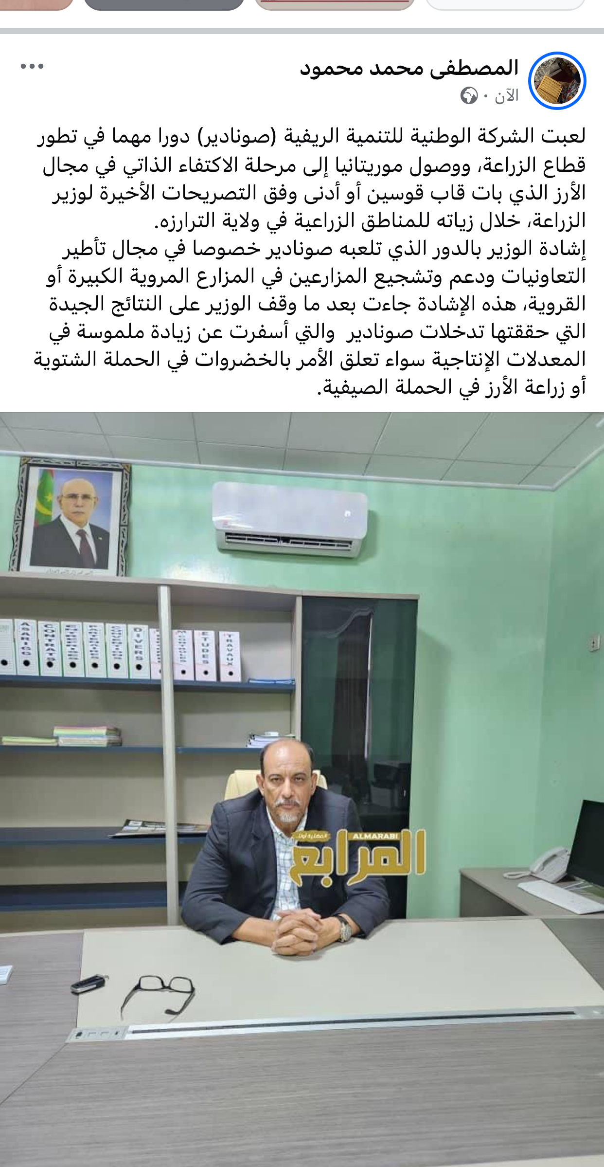 المساهمة الفاعلة ل”صونادير” في اتجاه تحقيق أهداف القطاع الزراعي عموما، والاكتفاء الذاتي من الأرز خصوصا، جاءت بفضل توجيهات رئيس الجمهورية السيد محمد ولد الشيخ الغزواني بضرورة تفعيل مساهمة صونادير في مجال الزراعة وإعطاءها أدوار جديدة للنهوض بالقطاع ومنحها الامكانات والموار اللازمة لذلك، بل وإعادة هيكلتها إداريا وتنظيميا من أجل هذه المهمات الجديدة، بعد أن كانت الشركة في السنوات الماضية غير قادرة على المواكبة الفاعلة لجهود الدولة في المجال رغم أن مؤسسة وطنية أنشأت منذ السبعينات من أجل هذا الغرض