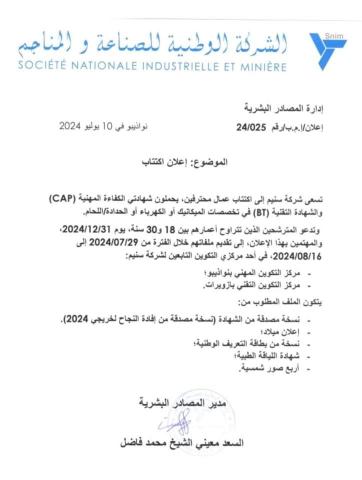 أعلنت الشركة الوطنية للصناعة و المناجم عن تنظيم مسابقة لاكتتاب عمال حرفيين يحملون شهادتي الكفاءة المهنية ( cap) أو الشهادة التقنية ( BT)
