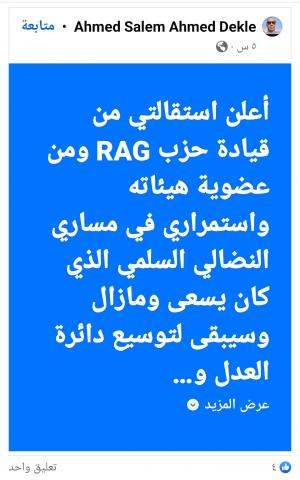 ولم يوضح أحمد دكله أسباب استقالته من الحركة، في إعلان نشره على صفحته في الفيسبوك.