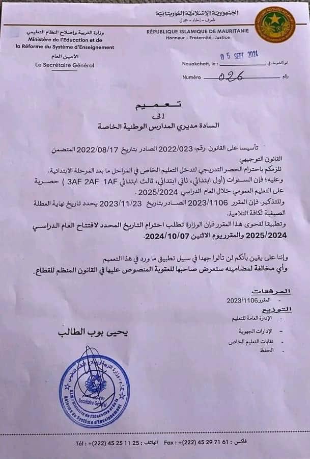 ويأتي التعميم بعد محاولة بعض المدارس الحرة افتتاح العام الدراسي بشكل مبكر دون التقيدبقوانين الجمهورية الإسلامية الموريتانية.