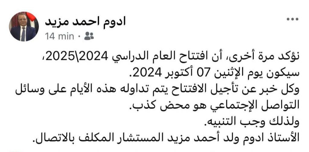 وقال ولد أحمد مزيد في منشور على فيسبوك إن العام الدراسي سيفتتح في السابع من شهر أكتوبر الجاري كما كان مقررا و أضاف أن أي خبر متعلق بتأجيل الدراسة لا أساس له من الصحة:
