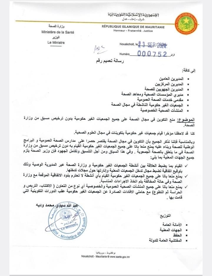 تعميم من معالي وزير الصحة السيد عبد الله سيدي محمد وديه بشأن منع التكوين في مجال الصحة على جميع الجمعيات غير الحكومية بدون ترخيص مسبق من وزارة الصحة