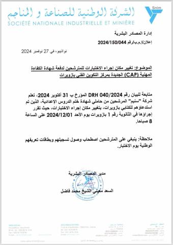 أعلنت مديرية المصادر البشرية بالشركة الوطنية للصناعة والمناجم (سنيم) أنه تم تغيير مكان إجراء الاختبارات لدفعة المرشحين لشهادة الكفاءة المهنية (CAP) الجديدة بمركز التكوين المهني في ازويرات.