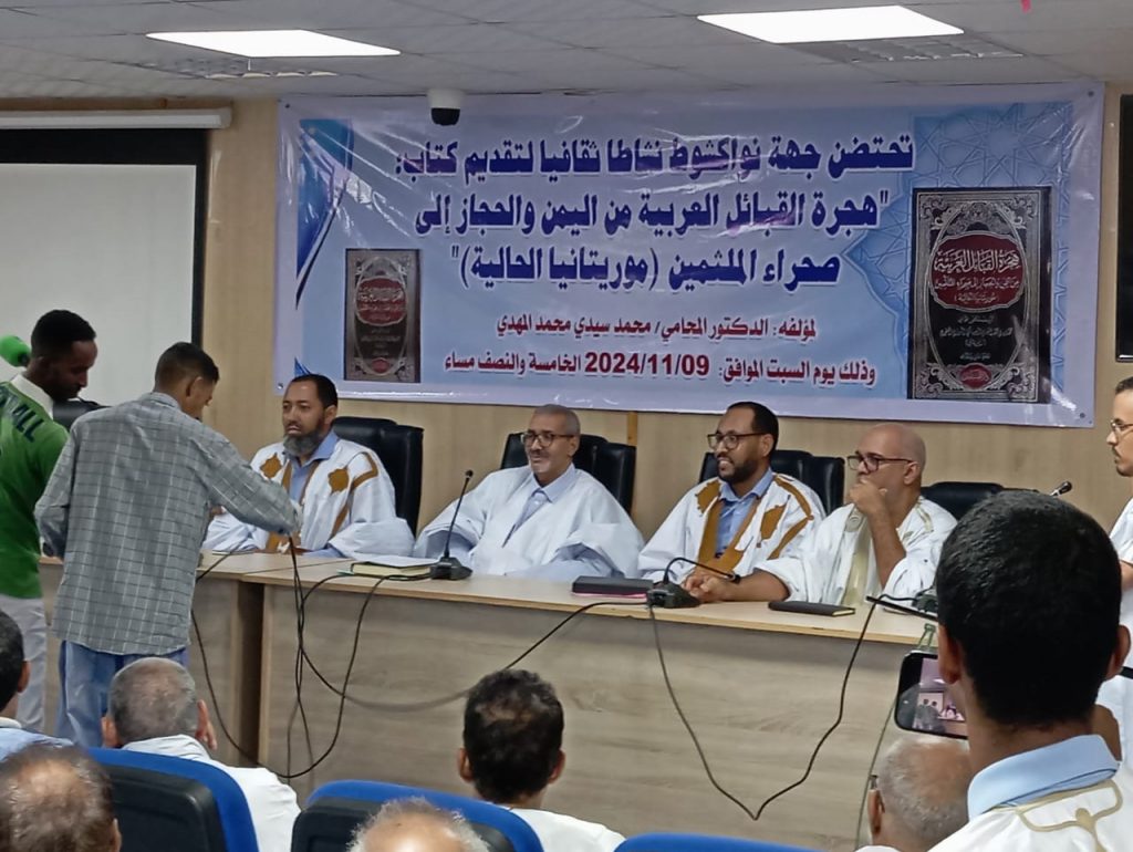 احتضنت قاعة المؤتمرات بالمجموعة الحضرية بنواكشوط مساء اليوم ندوة ثقافية لتقديم كتاب هو عبارة عن موسوعة تاريخية عن تاريخ هجرات القبائل العربية من اليمن والحجاز إلى أرض الملثمين، لمؤلفه للباحث والمؤلف والمحامي الدكتور محمد ولد محمد المهدي.