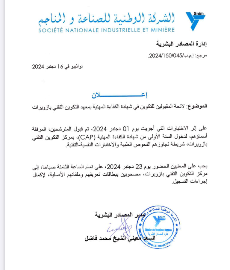 أعلنت الشركة الوطنية للصناعة والمناجم “اسنيم” لائحة المترشحين المقبولين للتكوين في شهادة الكفاءة المهنية CAP) بمعهد التكوين في ازويرات.
