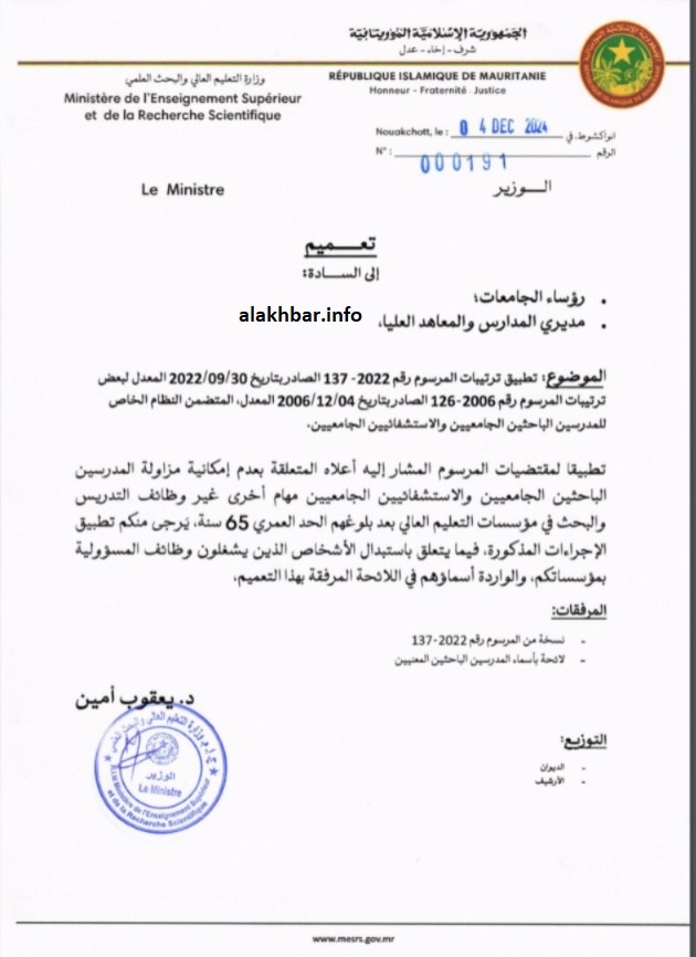 وجه معالي وزير التعليم العالي والبحث العالمي يعقوب ولد امين تعميما إلى رؤساء الجامعات ومديري المدارس والمعاهد العليا، أمرهم فيه بتطبيق ترتيبات المرسوم القاضي بتفريغ الأساتذة الجامعيين الذي وصلوا إلى 65 سنة “لمهام البحث والتدريس”.