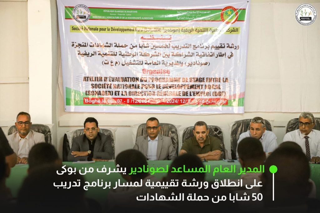 أشرف المدير العام المساعد للشركة الوطنية للتنمية الريفية “صونادير” السيد يرب ولد المانه صباح اليوم السبت 07/12/2024 من مدينة بوكى على انطلاق فعاليات ورشة تقييمية لمسار برنامج تدريب 50 شابا من حملة الشهادات ذات الصلة بالقطاع الزراعي .