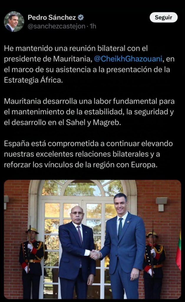 كتب رئيس حكومة إسبانيا بيدرو سانشيث في تغريدة على منصة إكس عقب اللقاء الذي جمعه مع رئيس الجمهورية السيد محمد ولد الشيخ الغزواني