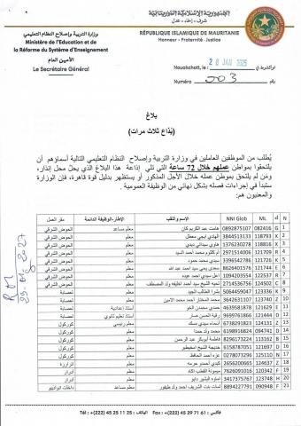 وهددت الوزارة بفصل الموظفين المعنيين بالإنذار من وظائفهم، مالم يلتحقوا بعملهم خلال 72 من إذاعة البلاغ، أو يستظهروا بقوة قاهرة.