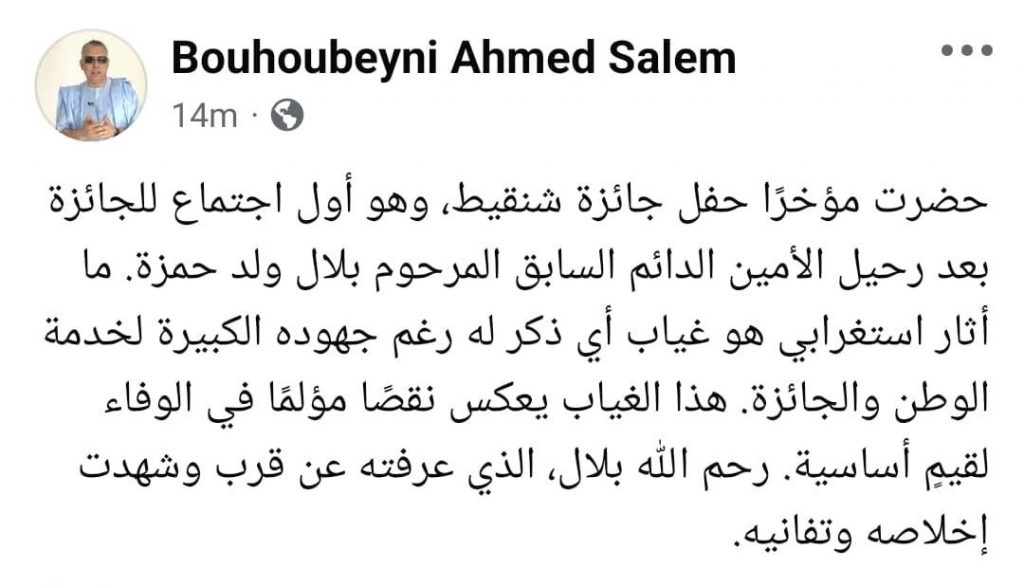 ولد بوحبيني : عدم ذكر لجنة جائزة شنقيط لأمينها الدائم السابق المرحوم حمزة بلال “يعكس نقصا مؤلما في الوفاء للقيم”