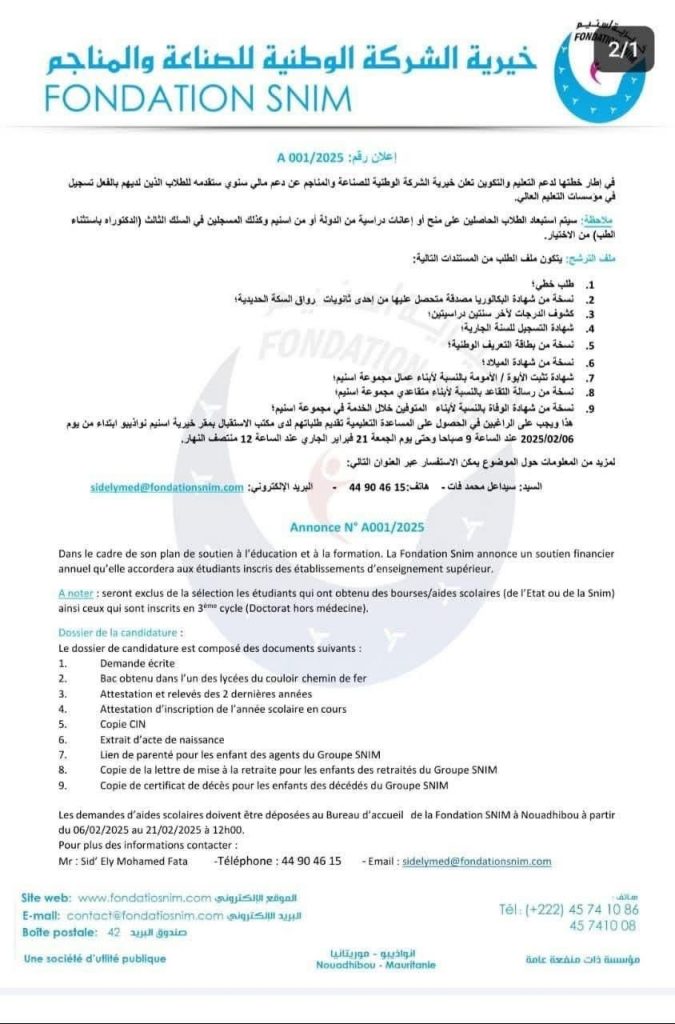 كما نوه الإعلان إلى أنه على الراغبين في الحصول على المساعدة التعليمية تقديم طلباتهم لدى مكتب الاستقبال بمقر خيرية اسنيم في نواذيبو ابتداء من يوم 6 فبراير 2025 إلى غاية الجمعة 21 فبراير 2025 عند الساعة 12 منتصف النهار.