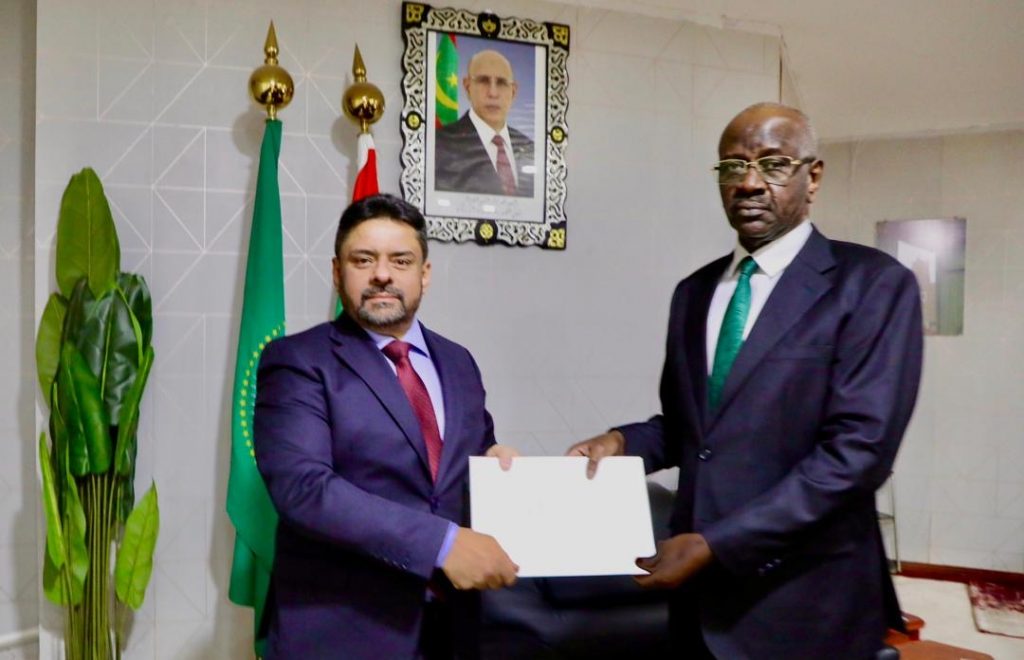 وخلال اللقاء تسلم معالي الوزير من الدبلوماسي الليبي نسخة من أوراق اعتماده بصفته سفيرا فوق العادة وكامل السلطة لدولة ليبيا الشقيقة لدى الجمهورية الإسلامية الموريتانية.