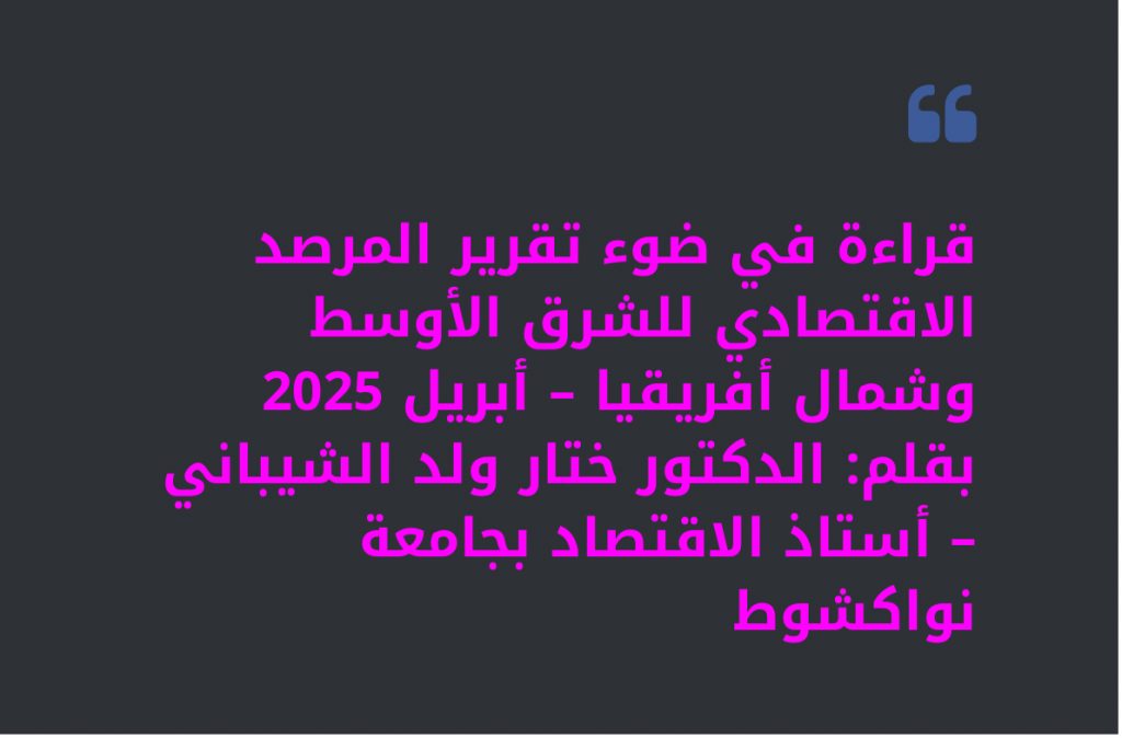أظهر تقرير المرصد الاقتصادي لمنطقة الشرق الأوسط وشمال أفريقيا الصادر في أبريل 2025 توقعات بنمو معتدل يبلغ 2.6% في المنطقة خلال العام الحالي، وسط تحديات اقتصادية عالمية تشمل النزاعات والصدمات المناخية. ويركز التقرير على أهمية دور القطاع الخاص في تعزيز النمو الاقتصادي وخلق فرص العمل. وفيما يخص موريتانيا، يتوقع أن يصل معدل النمو الاقتصادي إلى 4.2% في عام 2025، مقارنة بـ4.6% في 2024، رغم الإمكانات الكبيرة التي تمتلكها البلاد في قطاعات التعدين، الصيد، الزراعة، والثروة الحيوانية.