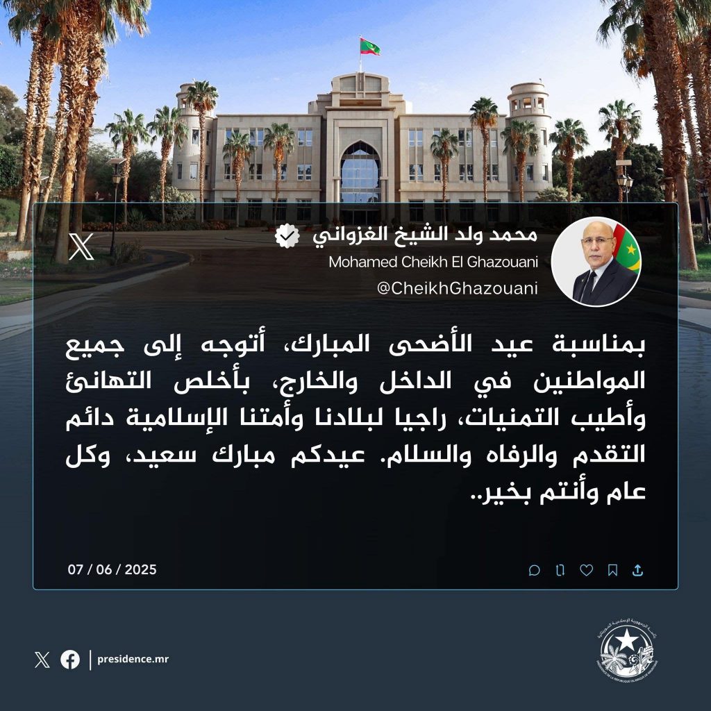 بمناسبة عيد الأضحي المبارك.. رئيس الجمهورية يهنئ جميع المواطنين في الداخل والخارج 6 يونيو, 2025 Print PDF eBook بمناسبة عيد الأضحى المبارك، أتوجه إلى جميع المواطنين في الداخل والخارج، بأخلص التهانئ وأطيب التمنيات، راجيا لبلادنا وأمتنا الإسلامية دائم التقدم والرفاه والسلام. عيدكم مبارك سعيد، وكل عام وأنتم بخير.. شاركها Facebook Twitter Stumbleupon LinkedIn Pinterest