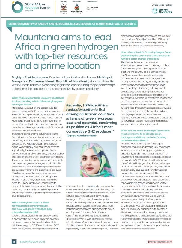 وأشارت منت عبيد الرحمن إلى أن تخصيص 5 بالمائة من السواحل يمكن أن يتيح إنتاج نحو 12 مليون طن من الهيدروجين سنويًا بأسعار تنافسية.