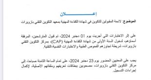 أعلنت الشركة الوطنية للصناعة والمناجم “اسنيم” لائحة المترشحين المقبولين للتكوين في شهادة الكفاءة المهنية CAP) بمعهد التكوين في ازويرات.ووفق الإعلان الذي أصدرته الشركة بهذا الخصوص، فإن النتائج جاءت على أثر الاختبارات التي أجريت للمترشحين يوم 01 من دجمبر الجاري، موضحة أن إن القبول النهائي مشروط بتجاوز المترشحين للفحوص الطبية والاختبارات …