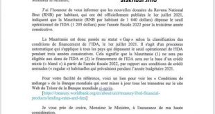 أبلغ البنك الدولي الحكومة الموريتانية بأنها “لن تكون مؤهلة للحصول على منح وتمويلات المؤسسة الدولية للتنمية IDA))، وذلك من ابتداء من السنة المالية 2022، والتي تبدأ بالنسبة للبند الدولي من يوليو 2021. وأضاف البنك الدولي في رسالة وجهتها ممثلته المقيمة في نواكشوط اكريستينا إزابيل إبناسو سانتوس فاتح سبتمبر إلى وزير …