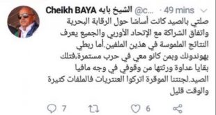 كتب رئيس الجمعية الوطنية الشيخ ولد بايه علي حسابه في تويتر أن صلته بقطاع الصيد “كانت أساسًا حول الرقابة البحرية واتفاق الشراكة مع الإتحاد الأوربي والجميع يعرف النتائج الملموسة في هذين الملفين”. وأضاف فى تغريدة نشرها اليوم الخميس 23 أبريل 2020″ أما ربطي بهوندونك وبمن كانو معي في حرب مستمرة،فتلك …