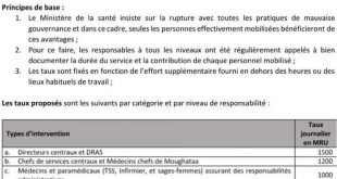 حددت وزارة الصحة تحفيزات مالية لصالح الطواقم الصحية العاملة في مجال مكافحة كورونا، مشيرة إلى أنهم “الأكثر تواجدًا بالميدان وتعرضا للخطر سواء منهم العاملون بالإدارة المركزية وبالمستويات الوسطية والعاملون بالميدان”. وتتراوح هذه التحفيزات ما بين 1500 و800 أوقية جديدة يوميا، إضافة إلى تعويض جزافي لمقام ليلة خارج مكان العمل قدرها …