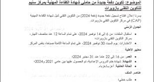 يسرنا إعلان افتتاح تسجيل دفعة جديدة (دفعة 2024) من التكوين التقني لنيل شهادة الكفاءة المهنية (CAP) في مركز التكوين التقني بازويرات. الجدول الزمني • استقبال الملفات: من 6 إلى 14 نوفمبر 2024، على تمام الساعة 12 عند منتصف النهار، بمركز التكوين التقني بازويرات؛ • الاختبارات: يوم السبت 30 نوفمبر 2024، …