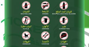 أصدرت الاتحادية الموريتانية لكرة القدم، قائمة بالمواد “المحظورة” داخل الملعب، خلال مباراة موريتانيا وبوتسوانا المُقرر إجراؤها غدا. وضمّت قائمة المواد “المحظورة” التي نشرتها الاتحادية على صفحتها بموقع فيسبوك، “الأسلحة” وقنّينات الماء المُثلج، والعلب والأكواب، إضافةً للمواد “الخطرة”. وشملت القائمة كذلك، الخوذات والأعمدة والحيوانات، والمفرقعات النّارية والقنابل الدخانية.