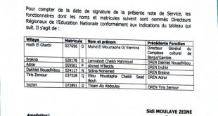 وقع الأمين العام لوزارة التهذيب الوطني وإصلاح النظام التعليمي سيدي ولد مولاي الزين أمس الثلاثاء مذكرة أجرى بموجبها تغييرات في صفوف المديرين الجهويين للتعليم، كما وقع مذكرة أخرى عين بموجبها مديرا عاما للمجمع الثقافي الموريتاني في غامبيا. وبموجب هذه المذكرة عين: – محمد المصطفى محمد الأمين مديرا جهويا للتعليم في …