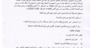 أعلنت وزارة الشؤون الإسلامية والتعليم الأصلي عن البدء في استقبال ملفات الترشح لإجراء امتحان النسخة الرابعة من “مسابقة جائزة رئيس الجمهورية لحفظ وفهم المتون المحظرية”. وحدد بيان الوزارة تاريخ استقبال الترشحات وذلك ابتداء من يوم الأربعاء الخامس والعشرين من ربيع الأول 1445 هـ، الموافق: 11 اكتوبر2023 م، وحتى نهاية دوام …
