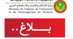 أبلغت وزارة الإسكان والعمران والاستصلاح الترابي سكان عدد من الأحياء الواقعة في مقاطعتي لكصر وتفرغ زينة بولاية نواكشوط الغربية، ومقاطعات تيارت ودار النعيم و توجنين، بولاية نواكشوط الشمالية؛ بأن عليهم تقديم وثائق الملكية، وفاتورة ماء أو كهرباء؛ لدى شباك خاص في الدور الأرضي بمبنى الوزارة؛ تقرر فتحه اعتبارا من يوم …