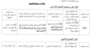قالت وزارة التهذيب الوطني وإصلاح النظام التعليمي إن اللجنة المعنية بالتحويلات حولت 62 معلما على مستوى التعليم الأساسي، و10 أساتذة على مستوى التعليم الثانوي، وذلك بعد استيفائهم الشروط المطلوبة للتحويل، والمعايير الواردة في المقرر المتعلق بالتحويلات. وأكدت الوزارة في توضيح صادر عنها أن اللجنة المعنية بالتحويلات تلقت 994 طلب تحويل …
