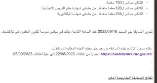 أعلنت وزارتا الوظيفة العمومية، والتهذيب الوطني، واللجنة الوطنية للمسابقات عن تنظم مسابقة اكتتاب خارجي لـ 1480 معلما. وتضمن إعلان المسابقة المنشور مساء اليوم، توزيع الوحدات المطلوبة إلى 400 معلم رئيسي، و100 معلم، لتلقي التكوين في مدارس تكوين العلمين. فيما سيتم الاكتتاب بشكل مباشر لـ 700 معلم، و126 معلما عقدويا من حاملي …