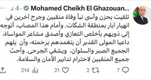 عبر رئيس الجمهورية السيد محمد ولد الشيخ الغزواني، عن حزنه لوفاة منقبين وإصابة آخرين في انهيار آبار للتنقيب عن الذهب بمنطقة الشگات شمال البلاد. وكتب رئيس الجمهورية عبر حسابه على منصة إكس (تويتر سابقا): “تلقيت بحزن وأسى نبأ وفاة منقبين وجرح آخرين في انهيار آبار بمنطقة الشگات”. وأضاف: “أمام هذا …
