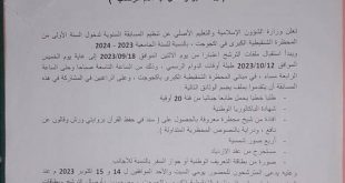 أعلنت وزارة الشؤون الإسلامية والتعليم الأصلي عن تنظيم المسابقة السنوية لدخول السنة الأولى من المعهد العالي للدراسات والبحوث الإسلامية، ومسابقة دخول السنة الأولى من المحظرة الشنقيطية الكبرى في أكجوجت بالنسبة للعام الجامعي 2023، 2024. وأوضحت الوزارة في بلاغ صادر عنها، أن استقبال ملفات الترشح اعتبارا من يوم الإثنين الموافق 04 …