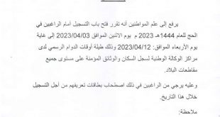 أكمل القراءة »الإعلان عن فتح التسجيل للراغبين في الحج للعام 1444 هجري 2023م