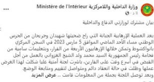 أعلنت وزارتا الدفاع والداخلية في بيان مشترك مقتل ثلاثة من الإرهابيين، وإلقاء القبض على الرابع، واستشهاد دركي أحد أبطال القوات المسلحة الباسلة. وأوضح البيان أن اللجنة الأمنية العليا المكلفة بمتابعة الملف توصلت بجملة من المعلومات قامت بتحليلها ورجحت منها الفرضية التي تقول بتواجد الإرهابيين بمنطقة في ولاية آدرار. وأضاف البيان …