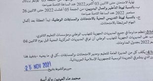 أصدر وزير التهذيب الوطني وإصلاح التعليم مقررا وزاريا يحدد تاريخ العطل الدراسية للعام 2021-2022 وذلك على النحو التالي: العطلة الأولى تبدأ 31 ديسمبر وحتى 10 يناير ” العطلة الثانية تبدأ 25 مارس وحتى 4 ابريل العطلة الأخيرة تبدأ من 3 يونيو وحتى 3 كتوبر