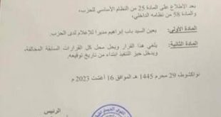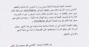 أعلنت اللجنة المركزية لمراقبة الأهلة أن يوم غد الجمعة سيكون فاتح شهر صفر 1445للهجرة جاء ذلك في البيان التالي الذي وقعه رئيسها القاضي/محمدمحمود ولد محمد صالح