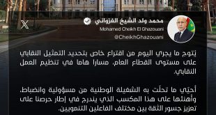 هنأ رئيس الجمهورية السيد محمد ولد الشيخ الغزواني، الشغيلة الوطنية، بمناسبة الاقتراع الخاص بتحديد التمثيل النقابي على مستوى القطاع العام. وكتب رئيس الجمهورية على صفحته بمنصة (X): “يُتوج ما يجري اليوم من اقتراع خاص بتحديد التمثيل النقابي على مستوى القطاع العام، مسارا هاما في تنظيم العمل النقابي. أُحيّي ما تحلّت …