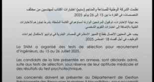 يمكنكم تحميل نتائج اختبارات المهندسين على الرابط التالي: Vous pouvez télécharger l’avis DRH portant sur les résultats des tests des ingénieurs en cliquant sur le lien suivant https://www.snim.com/sites/default/files/AFFICHAGE%20DRH%20%20TEST%20DES…