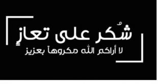 بسم الله الرحمن الرحيم بيـان شـكـر وامتنانمن أسرة أهل أحمد شريف بسم الله الرحمن الرحيم، والصلاة والسلام على أشرف الأنبياء والمرسلين قال تعالى { الَّذِينَ إِذَا أَصَابَتْهُم مُّصِيبَةٌ قَالُوا إِنَّا لِلَّهِ وَإِنَّا إِلَيْهِ رَاجِعُونَ أُولَئِكَ عَلَيْهِمْ صَلَوَاتٌ مِّن رَّبِّهِمْ وَرَحْمَةٌ وَأُولَئِكَ هُمُ الْمُهْتَدُون }، و قال تعالى : { الَّذِينَ …