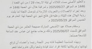 أعلنت اللجنة الوطنية لمراقبة الأهلة، الثلاثاء، أن غدا الخميس الموافق 29 مايو 2025 سيكون أول أيام شهر ذي الحجة للعام 1446 هـ، وذلك بعد تعذر رؤية الهلال مساء اليوم. وقالت اللجنة في بيان صادر عنها الثلاثاء، إنها اجتمعت بمباني الوزارة لمتابعة رؤية هلال ذي الحجة، وبعد إجراء التحريات اللازمة وتعذر …