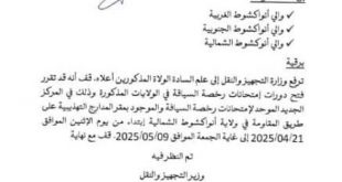 أعلنت وزارة التجهيز والنقل أنه فتح دورات امتحانات رخصة السياقة في ولايات نواكشوط الثلاثة؛ مبرزة في في رسالة وجهتها لولاة العاصمة الثلاثة، الامتحانات المقررة ستجري في المركز الجديد الموحد لاختبارات رخصة السياقة والموجود في المدارج التهذيبية على طريق المقاومة بولاية نواكشوط الشمالية . وسيتم إجراء الامتحانات اعتبارا من 21 أبريل …