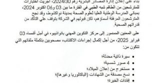أعلنت الشركة الوطنية للصناعة والمناجم (اسنيم) عن أسماء الطاقم الطبي الذي اكتتبته. وقالت إدارة الموارد البشرية في بيان إنه يجب حضور الطاقم في أجل أقصاه 3 فبراير 2025 إلى مركز التكوين المهني بنواذيبو من أجل إكمال إجراءات الاكتتاب ،مصحوبين بتكملة ملفاتهم التي تتكون من : سيرة ذاتية محدثة 4 صور …