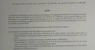 أعلنت وزارة التربية وإصلاح النظام التعليمي فتح باب التبادل بين المدرسين الراغبين في التحويل بين ولايات نواكشوط وولايات الداخل، وذلك اعتبارا من 06 يناير 2025. وقالت الوزارة في إعلان لها إن باب التبادل يظل مفتوحا إلى غاية 12 يناير 2025، وذلك عبر استخدام رمز كشف الراتب للولوج إلى استمارة التحويل. …