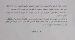 اجتمعت اللجنة الوطنية للأهلة بمباني وزارة الشؤون الإسلامية والتعليم الأصلي، مساء السبت 29 ربيع الثاني 1446هـ، الموافق 02 نوفمبر 2024 م لمراقبة هلال شهر جمادى الأولى 1446هـ. وبعد الاتصال بكافة ولايات الوطن و إجراء التحريات اللازمة ، لم تتوصل اللجنة لما يثبت رؤية الهلال هذه الليلة. وعليه فإن فاتح شهر …
