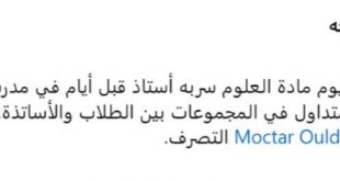 قال الأستاذ صدام أيوب بوميجه إن موضوع امتحان العلوم الطبيعية للبكالوريا اليوم سرّبه أستاذ قبل أيام في مدرسة حرة وأطلع طلابه على تفاصيله. وأضاف ولد بوميجه في تدوينة على حسابه في فيسبوك أن هذا “الكلام مسجّل ومتداول في المجموعات بين الطلاب والأساتذة”. ووصف ولد بوميجه هذا الأمر بأنه “مخالفة فجة”، …